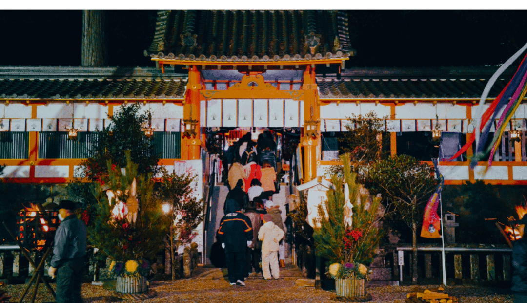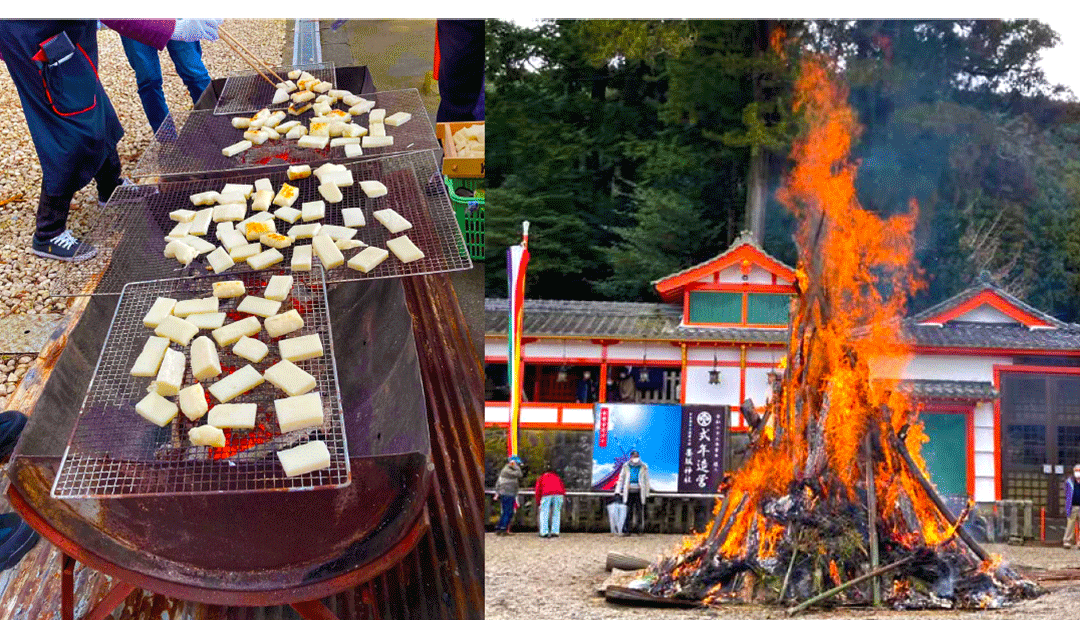 1年お守りいただいたお札やお守りをお焚き上げしその火に当たって無病息災を願う行事。参拝者には美味しい焼き餅入りの善哉の振る舞いがございます。